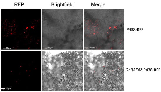 Primer Premier (v5.0) was used to construct specific primers based on the CDS sequence of the GhRAF42 genes (Table S1). To develop the fusion structure of translation RFP, the CDS and restriction site of insertion into the SalI restriction site of the pBinRFP vector were evaluated. According to the methodology, the recombinant plasmid was transformed into Agrobacterium tumefaciens strain LBA4404 then inserted into the second or third leaf of the tobacco. Under the same conditions, the vector of pBinRFP (RFP alone) was transformed into tobacco for planting control. Finally, the diseased tobacco leaves were covered in tin foil and placed in the dark for 48 h. After 48 h, use scissors to trim the leaves enclosing the injection site carefully. The altered gene expression was examined by CCD optical microscope observation (Leica Microsystems, Wetzlar, Germany).