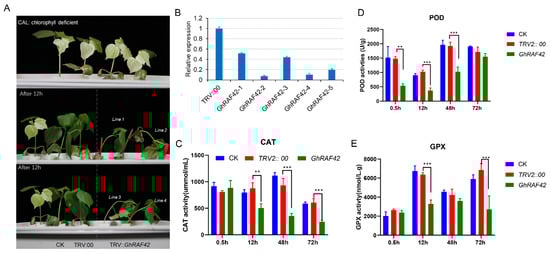 Figure 7. Silencing of GhRAF42 gene by VIGS and enzyme activity (CAT/POD/GPX) analysis under salt stress (A) After salt stress, the phenotype of control and gene silenced plants with albino appearance in comparison with CAL: chlorophyll deficient, CK: control, TRV::00: negative control and TRV::GhRAF42 containing leaves (B) Relative expression of 5 cotton plants with silenced gene (C) CAT contents in CK: control, TRV2::00 empty vector and TRV2::GhRAF42 candidate gene containing plants. (D) POD contents in CK: control, TRV2:00 empty vector and TRV2 = GhRAF42 candidate gene containing plants (E) contents in CK: control, TRV2::00 empty vector and TRV2 :: GhRAF42 candidate gene containing plants. The significant differences between transgenic lines and their corresponding control plants is Student ’s t-test; ** p < 0.01; *** p < 0.001.
