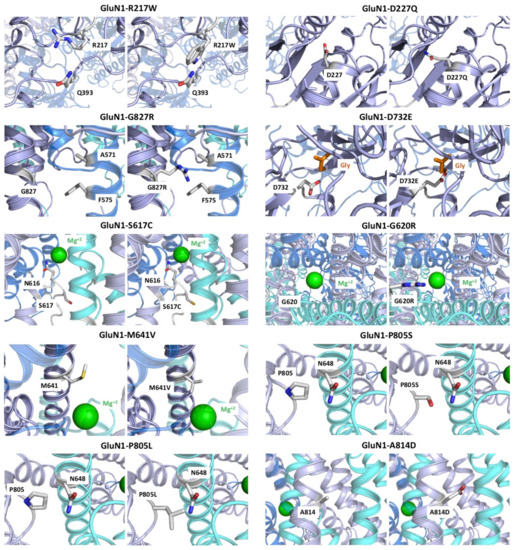 GluN1-R548 residue is located at the linker between the LBD and the TM domain. Mutation to tryptophan affects the signal transduction across the LBD and the TMD. The amino acid residue GluN1-S617 is located within the NMDAR channel pore, at the vicinity of GluN1-N616 residue that interacts with Mg2+ (NMDAR blocker at resting membrane potential). Despite the substitution to a cysteine residue in GluN1-S617C only implies a minor change in the physicochemical properties of the side chain, molecular modeling indicates a modification of the magnesium cavity and the pore channel. GluN1-G620 residue is placed at the bottom of the channel, exposed to the pore channel. Mutation to arginine in GluN1-G620R introduces a big positive amino acid side chain to the center of the pore channel, affecting ion influx and avoiding magnesium block. GluN1-M641 amino acid is located at the pore of the channel (M3 domain) and close to Mg2+. GluN1-M641V variant results in a positioning of V641 to the pore channel, facing magnesium. Thus, GluN1-M641V variant is predicted to affect magnesium-mediated NMDAR blockade. GluN1-P805 is situated within a loop at the beginning of M4 pointing the SYTANLAAF motif of GluN2A,B subunits. Mutation to leucine or serine (GRIN1-P805L and GRIN1-P805S, respectively) distorts the bending of M4. While leucine presence in GRIN1-P805L variant positions close to N648 residue of the SYTANLAAF motif, substitution to a serine residue in P805S variant is not able to reach the SYTANLAAF motif. Thus, GRIN1-P805L is predicted to induce a higher distortion and, consequently, functional, and clinical outcomes, than GRIN1-P805S. GRIN1-A814 amino acid is located at the transmembrane domain M4, facing the membrane and M2 domain of GluN2A/GluN2B subunits. Mutation to an aspartate residue in GRIN1-A814D is predicted to affect subunit interaction due to a new negative charge between the two subunits. GluN1-M818 is located within the M4 domain of the TMD, facing the cell membrane. In addition to this location, the substitution to a valine residue (GRIN1-M818V variant) would potentially induce a slight change, since the side chain physicochemical properties are similar, and the most significant difference is the introduction of a bigger side chain. Overall, the structural analysis of GRIN1 variants affecting NMDAR channel gating showed that GRIN1-P805L, -G620R and -M641V are potentially causing a severe effect on the structure and function on the NMDAR, GRIN1-S617C, -P805S and -M818V are predicted as moderate, while GRIN1-A814 is predicted as causing weak disturbance of the NMDAR.