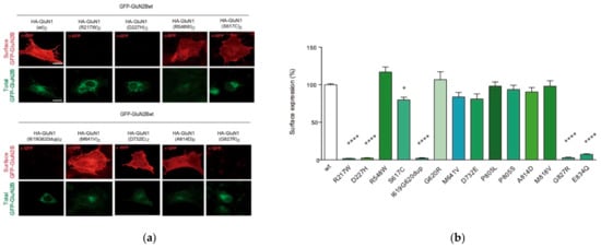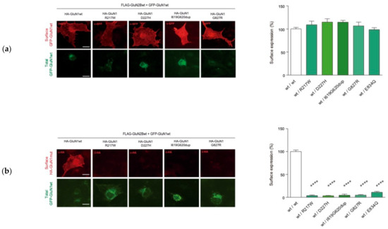 Upon the identification of biallelic GRIN1 de novo variants disturbing NMDAR surface density, namely GRIN1-SDD (surface density deficient GRIN1 variants), we investigated the functional relationship between GluN1-SDD and GluN1wt subunits, to determine putative dominant negative or rescue effects. To test these potential effects, COS-7 cells were cotransfected with Flag-GRIN2B-wt construct and an equimolar ratio of differentially-tagged GFP-GRIN1wt and HA-GRIN1-SDD plasmids. Surface expression analysis showed that GluN1wt subunit surface expression was unaffected by the presence of GluN1-SDD variants, indicating that GluN1-SDD subunits do not exert a dominant negative effect over GluN1wt subunits (Figure 4a), as confirmed by electrophysiological recordings (Supplementary Materials Figure S1). In parallel with this analysis, immunofluorescence studies revealed that the presence of GluN1wt subunit was not rescuing the surface expression of GluN1-SDD subunits (Figure 4b).