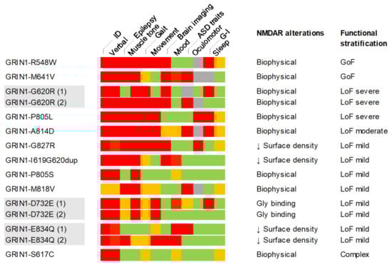 The clinical assessment of individuals harbouring GRIN1-DNVs showed the presence of both pathognomic traits (ID, communication skills, motor alterations) of reduced clinical stratification power, together with GRIN1 variant-dependent clinical manifestations (mood disorders, sleep pattern, GI distress) of putative clinical stratification dimension. In order to extract a clinical severity scale for further genotype-phenotype correlation, the clinical items severity (absence, mild, intermediate, severe; Figure 6) was annotated and the percentage of maximal scores was computed (Figure 6). Despite GRIN1 cohort’s relatively small size, the heat map showed both the prevalence and severity of clinical symptoms, allowing to propose a preliminary genotype-phenotype severity stratification. Based on functional annotation studies, mutations were classified into GoF, LoF (severe, moderate, mild) and complex, and correlated with the percentage of clinical items with maximal severity score (red squares). According to non-weighted clinical severity criteria, GRIN1 GoF and LoF (severe, moderate) showed a high severity (50% or above), while mild LoF and complex GRIN1 variants were associated with less severe clinical symptoms (50% or below). Interestingly, GRIN1 variants harboured by two unrelated patients (GRIN1-G620R, GRIN1-D732E, GRIN1-E834Q) showed similar clinical severity (same severity group), supporting the severity scale validity and in agreement with the high penetrance proposed for GRD genetic condition.