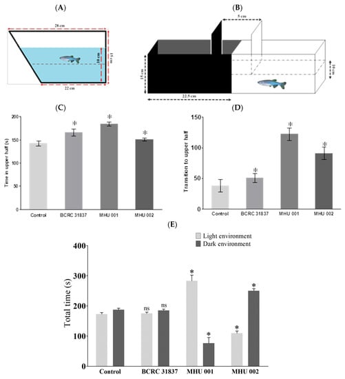 - Maximino, C.; de Brito, T.M.; Dias, C.A.G.; Gouveia, A., Jr.; Morato, S. Scototaxis as anxiety-like behavior in fish. Nat. Protoc. 2010, 5, 209–216. [Google Scholar] [CrossRef] [PubMed]