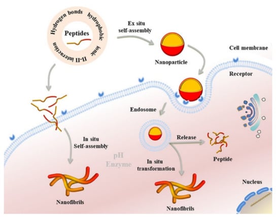 In ex situ construction, SAP nanomaterials can be produced in many structures (i.e., nanofibers [], nanoparticles [], hydrogels [,]), which are internalized within cells by endocytosis. In particular, delivery process includes several phases: blood circulation and accumulation, cell penetration, cell internalization, and finally drug release [].