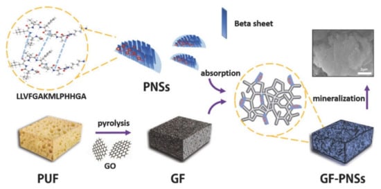 Functional peptide sequences were used to create 3D graphene foam (GF)-based hydroxyapatite minerals. GF foam was prepared by coating polyurethane foam (PUF) template in graphene oxide (GO) solution, followed by PUF removal by pyrolysis. The peptide molecule LLVFGAKMLPHHGA was first self-assembled forming 2D peptide nanosheets (PNSs) that were then noncovalently conjugated onto the graphene foam (Figure 4). The obtained scaffold exhibited an adaptable shape, a low weight, and high porosity, providing potential applications for drug delivery and bone tissue engineering [].