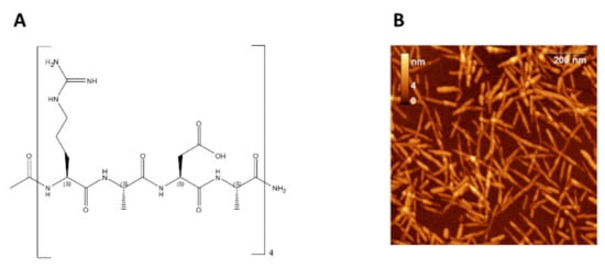 Considering these physiological roles, in recent years, the self-assembling process has been largely studied; in particular, self-assembling peptides (SAPs) are arousing great attention as novel biomaterials in different fields such as nanomedicine, nanomaterials, and nanobiotechnology [,,,]. Generally, SAPs consist of monomers of short (8–16-mer peptides) or repeated sequences able to assemble to form well-ordered nanostructures.