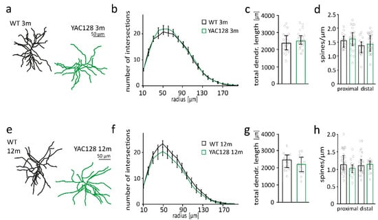 Morphological changes in MSNs precede neuron loss and are an early indicator of HD pathology [40]. Spine density is mildly reduced in 3–4-month-old YAC128 and strongly reduced by more than 30% in YAC128/FVB mice at an age of 12 months [12,31,41,42]. To investigate the relevance of the strain background on mHTT toxicity, we quantified spine number in YAC128 mice in the C57BL/6 background (YAC128/BL6). The number of spines in proximal, and distal dendrites of MSNs were not different between 3-month-old YAC128/BL6 mice and control littermates (proximal: t-test; p = 0.6939; distal: t-test; p = 0.1947) (Figure 1d). Spine number was also not reduced in MSNs of 12-month-old YAC128/BL6 mice (t-test; p = 0.0697) (Figure 1h). Sholl analysis of biocytin-filled and reconstructed MSNs revealed no difference in dendritic arborization as well as total dendritic length between 3-month or 12-month-old WT and YAC128/BL6 mice (t-test; 3 months: p = 0.311; 12 months: p = 0.1775) (Figure 1a–c,e–g). Thus, we observed no changes in MSN morphology in both 3-month and 12-month-old YAC128/BL6 mice in contrast to the alterations in MSN morphology with reduced spine density in 3- and 12-month-old YAC128/FVB mice [12,41,42].