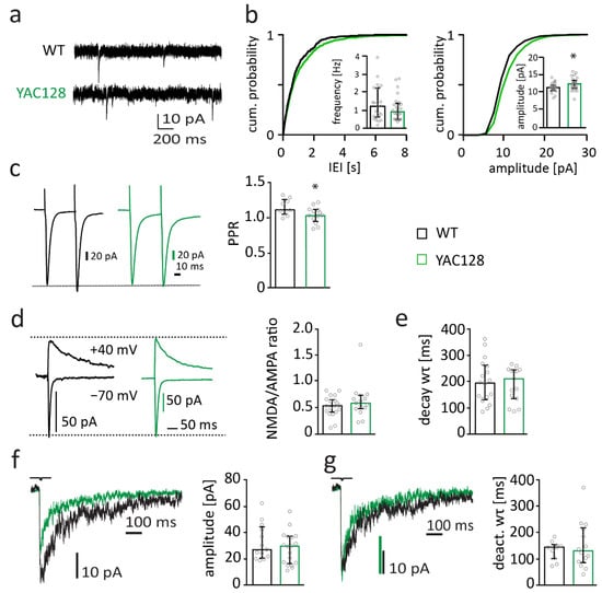 Synaptic dysfunction of MSNs occurs early in HD patients and in HD mouse models [8,43,44]. Thus, alterations in synaptic function are present in YAC128 mice with FVB background already at an age of 1.5 months [45,46,47]. At the age of 12 months and older, synaptic function of MSNs from YAC128/FVB mice is severely disturbed [45,46,48]. To investigate whether the strain background affects the occurrence of synaptic dysfunction in YAC128 mice, we recorded α-amino-3-hydroxy-5-methyl-4-isoxazolepropionic acid receptor (AMPAR)-mediated miniature excitatory postsynaptic currents (mEPSCs) in striatal MSNs of YAC128/BL6 and WT mice. Neither mEPSC frequency nor amplitude were different between genotypes in 3-month-old mice (Supplementary Figure S1b). mEPSC frequency was also not affected in 12-month-old YAC128/BL6 mice (there was a trend to reduced frequency in YAC128/BL6 mice; Mann–Whitney test, p = 0.435) (Figure 2a,b). There was a small but significant increase in mEPSC peak amplitude in MSNs from YAC128/BL6 mice (t-test, p = 0.021) (Figure 2a,b). Considering the trend to reduced mEPSC frequency in YAC128/BL6 mice, we wondered whether there is a significant reduction in older YAC128/BL6 mice. However, neither mEPSC frequency nor amplitude were altered in 18-month-old YAC128/BL6 mice when compared to WT littermates (Supplementary Figure S1d).