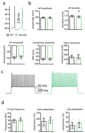 Electrophysiological membrane properties of MSNs are affected in 7- to 12-month-old YAC128 mice in the FVB background [38,50]. We studied basic membrane properties in MSNs from 12-month-old YAC128/BL6 mice and littermate controls. There was no genotype difference in input resistance (Mann–Whitney test; p = 0.748) and membrane potential (t-test; p = 0.4122) (Figure 3b). Additionally, action potential threshold (t-test; p = 0.2182) and amplitude (t-test; p = 0.4666) were not affected in MSNs from 12-month-old YAC128/BL6 mice (Figure 3b). Action potential duration was slightly decreased in MSNs from YAC128/BL6 mice (Mann–Whitney test; p = 0.0297) (Figure 3b).
