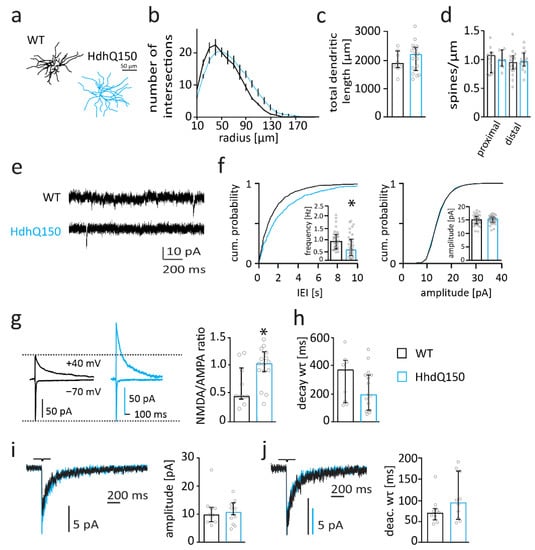 Synaptic function is impaired in 6-month-old HdhQ150/BL6 mice. (a) Example reconstructions of MSNS. (b) Sholl analysis with number of dendrite intersections per radius and (c) bar graph of total dendritic length of MSNs from WT (n = 8) and HdhQ150/BL6 (n = 17) mice. (d) Bar graph of spine number per µm of MSNs from WT (n = 10) and HdhQ150/BL6 (n = 18) mice. (e) Sample traces of mEPSC recordings from MSNs from 6-month-old WT and HdhQ150/BL6 mice. (f) Cumulative distribution plot of mEPSC IEIs and amplitude as well as bar graphs of the median mEPSC frequency and amplitude of MSNs from 6-month-old WT (black, n = 31) and HdhQ150/BL6 (blue, n = 32) mice. (g) Sample traces of NMDAR- and AMPAR-mediated currents recorded at a holding potential of +40 mV and −70 mV, respectively, and bar graph of the NMDA/AMPA-ratio of MSNs from WT (n = 10) and HdhQ150/BL6 (n = 15) mice. (h) Bar graph of the time constant (wτ) of NDMAR-mediated current decay in MSNs of WT (n = 9) and HdhQ150/BL6 (n = 15) mice. (i) Sample traces of extrasynaptic NMDAR-mediated currents recorded in nucleated patches and bar graph of peak current amplitudes of MSNs from WT (n = 9) and HdhQ150/BL6 (n = 10) mice. (j) Peak-scaled sample traces of extrasynaptic NMDAR-mediated currents recorded from nucleated patches, and bar graph of the deactivation time constant (wτ) of currents from MSNs of WT (n = 9) and HdhQ150/BL6 (n = 10) mice. Bar graphs are depicted as median ± IQR. * = p < 0.05.