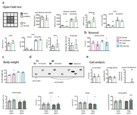 Motor performance in 9-month-old YAC128/BL6 mice was additionally studied using the Rotarod test. Since body weight can influence the fall latency in Rotarod experiments, we measured the weight of the animals. Male YAC128/BL6 mice had a similar weight compared to male WT mice (Figure 6c), and stayed for significantly less time on the Rotarod (t-test; p = 0.0364; Figure 6b) than male control mice. Although female YAC128/BL6 mice were significantly heavier than female WT (t-test; p = 0.01) (Figure 6c), fall latency of female mice was not different between genotypes (t-test; p = 0.2873) (Figure 6b).