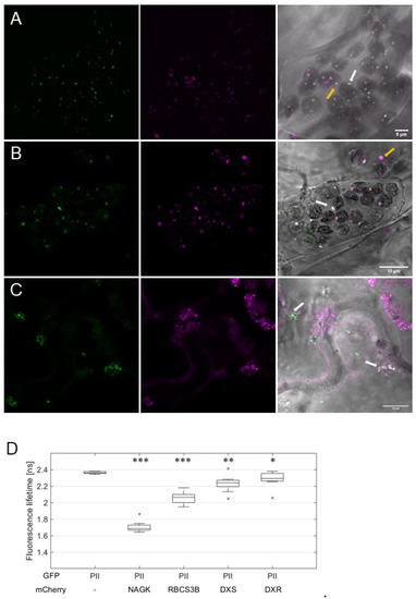 These observations implied that the interaction of AtPII with itself and other proteins occurs in PII foci. To confirm this finding, we co-expressed AtPII and its putative interacting proteins as C-terminal fusions to GFP and mCherry, respectively, in suitable 2in1 vectors. Then, these vectors were infiltrated into tobacco and FRET/FLIM analyses were applied to co-localizing fluorescent signals. In Figure 4A–C, the co-localization of GFP and mCherry signals was observed in all experiments in dot-like structures. Fluorescence lifetime measurements (FLIM) revealed significantly reduced GFP fluorescence lifetime values of the co-localizing signals in comparison to AtPII-GFP alone (Figure 4D). This observation confirms the assumption of physical interaction of AtPII with itself and other proteins in PII foci as such a reduction in fluorescence lifetime only occurs when two fluorescent proteins are at a critical distance of <10 nm [25].