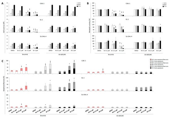 2.4. Combined Application of Ibrutinib and AS-605240 Induces Apoptosis and Necrosis of CLBL-1