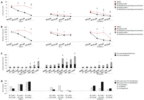 2.3. Combined Application of Ibrutinib and AS-605240 Enhances Inhibition of CLBL-1 Proliferation and Metabolic Activity