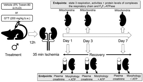 It has been shown that male mice are more susceptible to ischemic kidney injury when compared with females and that these differences are due to the actions of testosterone [,]. Thus, adult (3–4 months old) male mice were used to determine if GTT has protective effects against ischemic injury in the kidney. Mice were anesthetized with sodium pentobarbital (50 mg/kg b.w.; Ovation Pharmaceuticals, Deerfield, IL, USA) and all surgical procedures were performed under sterile conditions. Following a midline incision of the abdomen, kidneys were exposed and decapsulated, and both renal hila were clamped for 35 min with small vascular clamps to induce bilateral renal ischemia as described previously [,,,]. While renal arteries of both kidneys were clamped, mice were placed on a heating pad that maintained a temperature of 37 °C. During that time, approximately 0.5 mL sterile saline was applied intraperitoneally to prevent fluid loss and dehydration. After 35 min of ischemia, clamps were released, both kidneys were reperfused, checked for any perfusion problems, and the animal abdomen was closed using 4-0 silk suture. Sham operations involved all surgical procedures and kidney manipulations without inducing ischemia. The mice were returned to their cages, allowed free access to food and water, and given buprenorphine subcutaneously as needed for the first 72 h post reperfusion to control pain. Animals were closely monitored for 168 h (7 days) after surgery. On days 1, 3, and 7 after ischemia, animals were euthanized, and blood and kidneys were harvested to assess the endpoints, which included renal functions, tissue morphology, mitochondrial functions and enzyme activities, and ATP content in the renal cortex.