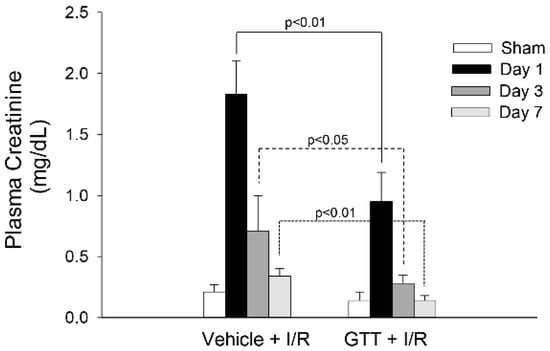 The experimental design for this study, the treatments of animals, and the endpoints measured are shown in Figure 1. Treatment of mice with the vehicle (5% Tween-80 in H2O) had no effect on serum creatinine levels (0.18 ± 0.04 vs. 0.21 ± 0.06 mg/dL in vehicle treated vs. nontreated control mice). Ischemia induced nine-fold increases in serum creatinine levels at 24 h of reperfusion in mice treated with the vehicle (Figure 2). Serum creatinine levels in the vehicle-treated mice gradually declined after reperfusion and recovered within 7 days after ischemia (Figure 2). GTT treatment significantly reduced increases in serum creatinine levels at 24 h after ischemia in comparison with the levels observed in mice treated with the vehicle (Figure 2). Further, the levels of serum creatinine in GTT-treated mice recovered by day 3 after ischemia (Figure 2). These data show that the treatment with GTT reduces ischemia-induced decreases in renal function and promotes recovery of kidney functions after ischemia-induced acute kidney injury.