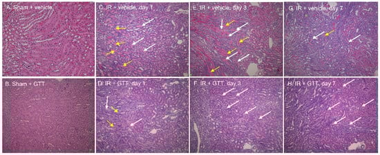 The effect of γ-tocotrienol (GTT) administration (200 mg/kg b.w.) on the morphology of the renal cortex at different time points after bilateral renal ischemia (35 min) in mice. (A) Sham-operated kidney ± vehicle—day 1. (B) Sham-operated kidney ± GTT—day 1, (C) Ischemia ± vehicle—day 1, (D) Ischemia ± GTT—day 1, (E) Ischemia ± vehicle—day 3, (F) Ischemia ± GTT—day 3, (G) Ischemia ± vehicle—day 7, (H) Ischemia ± GTT—day 7. The vehicle and GTT were administered subcutaneously 12 h prior to surgery to induce ischemia. The images are representative of three to four kidneys obtained from individual male mice used in each treatment group. The images were acquired using Nikon Eclipse E800 light microscope and Nikon Plan Apo objective (10×). Magnification × 122. Yellow arrows show necrotic proximal tubules. White arrows show regenerating tubules.