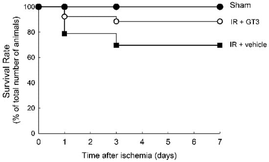Administration of γ-tocotrienol (GTT) improves survival rate after ischemia-induced acute kidney injury. The comparison of survival of sham mice treated with the vehicle (5% Tween80) or GTT (200 mg/kg b.w. in 5% Tween 80), mice treated with vehicle followed by bilateral ischemia (35 min) and reperfusion, and mice treated with GTT followed by bilateral ischemia (35 min) and reperfusion. The vehicle and GTT were administered to mice 12 h prior to surgery to induce ischemia.