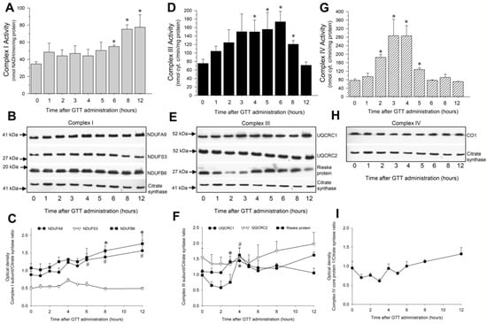 Activity of mitochondrial ubiquinol:cytochrome c oxidoreductase (complex III) was increased 1.6 and 2.5-fold at 3 h and 4 h after GGT administration, respectively, and remained increased until 8 h after the treatment (Figure 6D). The increases in activity of complex III preceded increases in the activity of complex I and returned to control levels by 12 h after the treatment when the activity of complex I was elevated (Figure 6A,D). Increases in the activity of complex III at 3 h and 4 h after GTT administration were associated with elevated mitochondrial levels of the ubiquinol-cytochrome c reductase core protein 1 (UQCRC1) and Rieske subunit of complex III (Figure 6E,F).