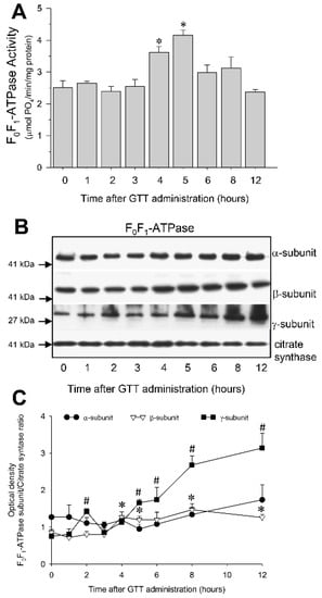 Administration of γ-tocotrienol (GTT, 200 mg/kg b.w.) to mice increases activity of F0F1-ATPase in renal cortical mitochondria. (A) Activity of F0F1-ATPase in mitochondria isolated from renal cortices of C57BL/6J male mice at different time points after GTT treatment. Results are the average ± S.E. of data obtained from four animals euthanized per time point after treatment. (B) Protein levels of subunits α, β catalytic), and γ (central stalk) of F0F1-ATPase in mitochondria isolated from renal cortices of C57BL/6J male mice at different time points after GTT administration. Immunoblots were carried out as described in Methods. Original blots were stripped off and re-probed using antibodies recognizing other subunits of F0F1-ATPase. The levels of citrate synthase were used as a loading control. The images are representative of immunoblots of renal cortical mitochondria obtained from three animals euthanized per time point after treatment. (C) Densitometric analysis of immunoblots of subunits α, β, and γ of F0F1-ATPase in mitochondria isolated from renal cortices of C57BL/6J male mice at different time points after GTT treatment. The data represent immunoblots of renal cortical mitochondria obtained from three animals euthanized per time point after treatment. * And # represent values significantly different (p < 0.05) from respective controls.