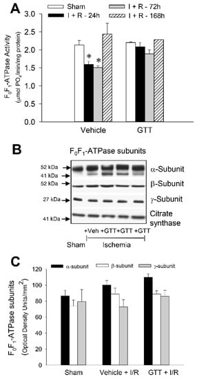 Ischemia decreased F0F1-ATPase activity in renal mitochondria of vehicle-treated mice to 50% of sham controls at 72 h and recovered by day 7 post-reperfusion (Figure 9A). This decrease was not accompanied by changes in protein levels of α, β or γ subunits of F0F1-ATPase in renal cortical mitochondria (Figure 9B,C). In contrast, no decrease in the activity of F0F1-ATPase occurred in mice treated with GTT before ischemia-induced AKI at any time point studied (Figure 9A). These data show that treatment of mice with GTT prevents decreases in the activity of F0F1-ATPase after ischemic injury in the kidney and that GTT-offered protection is not through changes in protein levels of F0F1-ATPase subunits that form the catalytic F1 domain of this enzymatic complex.