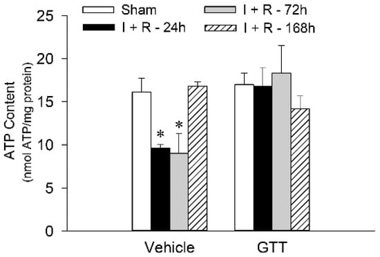 Renal cortical ATP levels in mice treated with the vehicle declined to 60% and 55% of sham controls at 24 h and 72 h, respectively, after ischemia/reperfusion (9.6 ± 0.4 and 9.0 ± 2.2 nmol/mg protein at 24 h and 72 h, respectively, after ischemia vs. 16.1 ± 1.6 nmol/mg protein in renal cortical tissue of sham controls) (Figure 10). ATP content in renal cortex of vehicle-treated mice recovered by day 7 after ischemia (Figure 10). Administration of GTT had no effect on ATP content in cortices of noninjured kidneys (Figure 10). However, GTT prevented decreases in ATP content in renal cortical tissue at all tested time points after ischemia (Figure 10). These data show that GTT prevents energy deficits and preserves ATP content in the renal cortex of the ischemia-injured kidney.