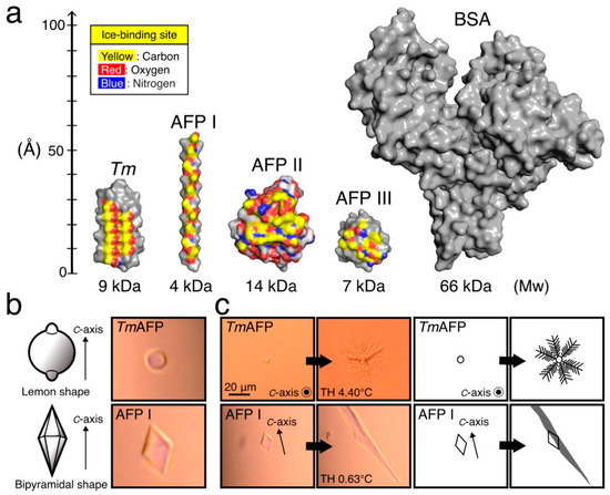 Antifreeze proteins (AFPs) purified from cold-adapted organisms are extraordinary macromolecules that commonly bind to embryonic ice crystals to inhibit their growth [12,13,14], and to the cell membrane to improve its integrity [15,16]. Fish-derived AFPs are categorized as type I–III and antifreeze glycoprotein (AFGP). AFP I is an alanine-rich amphipathic α-helical polypeptide (Mw = 3.5 kDa); AFP II is a globular protein with significant structural similarity with the C-type lectin (Mw = 14 kDa); AFP III is another globular protein composed of twisted loops folded into triple-strand β-sheets (Mw = 6.5 kDa); and AFGP (Mw = 2.6–34 kDa) is a repetitive polypeptide of (Ala–Ala–Thr)n (n = 4–50), in which Cβ of Thr is glycosylated with a disaccharide β-D-galactosyl-(1 3)-α-N-acetyl-D-galactosamine [12]. A β-helical AFP (Mw = 9 kDa) was discovered from the larvae of the beetle Tenebrio molitor (denoted TmAFP) [12]. Fish and insect AFPs have been shown to locate ice-like organized waters on their surfaces, which are thought to undergo complementary binding to the waters comprising the basal, prism, and/or pyramidal planes of single ice crystals [17,18]. The potential for specific or multiple ice plane binding depends on the AFP type. The ice-binding of AFP modifies a single ice crystal into a bipyramid or a lemon-like morphology, according to the ice plane specificity [19,20]. Ice-binding also depresses the freezing point (Tf) of the solution without significantly affecting the melting point (Tm), where the temperature difference between Tm and Tf is called thermal hysteresis (TH) [21,22]. AFPs are categorized into hyperactive or moderately active species according to their TH activity [19,23,24].