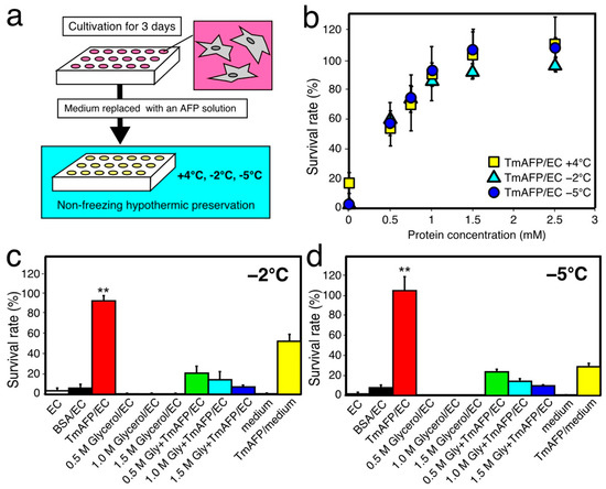 Survival rate of RIN-5F cells after 1 day of hypothermic preservation. (a). A flow chart of the preservation experiment. The cells were cultivated for 3 days at 37 °C in a 96-well plate before preservation experiments. (b). Survival rate (%) of RIN-5F cells evaluated at +4 °C, −2 °C, and −5 °C with Euro Colins (EC) solution containing 0–2.5 mM of TmAFP. (c,d). The survival rates evaluated at −2 °C and −5 °C with the EC solution containing 0–1.5 M of glycerol and/or 1.5 mM TmAFP. Asterisk shows that the p-value vs. control (EC solution) is statistically significant (p < 0.01).