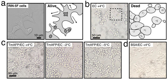 Photomicroscope images of cells are also informative regarding their viability (Figure 3). Namely, living cells observed in the cultivation medium are clumped together and elongated around one another (Figure 3a). In contrast, dead cells are distinctly rounded and detached (Figure 3b). The swelling of cells was also detected during the +4 °C preservation and in the present experiments; this was ascribed to chilling damage [25,26]. As shown in Figure 3c, the RIN-5F cells were clumped together and elongated, as in Figure 3a, during nonfreezing hypothermic preservation at +4 °C-, −2 °C, and −5 °C with TmAFP, suggesting a superior cell-protection ability of this protein. In contrast, the cells preserved with the BSA-containing EC solution were rounded and detached (Figure 3d), suggesting the ineffectiveness of BSA. Note that the cells were mostly rounded and ruptured when preserved with glycerol-dissolved EC solution (Figure S3), while they tended to be clumped together when TmAFP was added to the solution. These results suggest that TmAFP binds to the lipid bilayer of RIN-5F cells to stabilize their membrane integrity, similarly to fish AFPs [25].