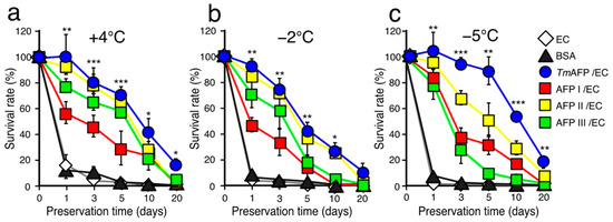 Survival rate (%) of RIN-5F cells preserved with EC solution containing AFP. (a). Time-dependence of the cell survival rate (%) after nonfreezing hypothermic preservation with the EC solution containing 1.5 mM of BSA, TmAFP, or AFPI–III at +4 °C. (b). Time-dependence data obtained at −2 °C. (c). Time-dependence data obtained at −5 °C. The solutions were not frozen at −2 °C and −5 °C during the preservation experiments for a maximum of 20 days. The TmAFP-containing EC solution always gave the best results (blue circles). Asterisk shows that p-value vs. control (EC solution) is statistically significant (* p < 0.05, ** p < 0.01, *** p < 0.001).