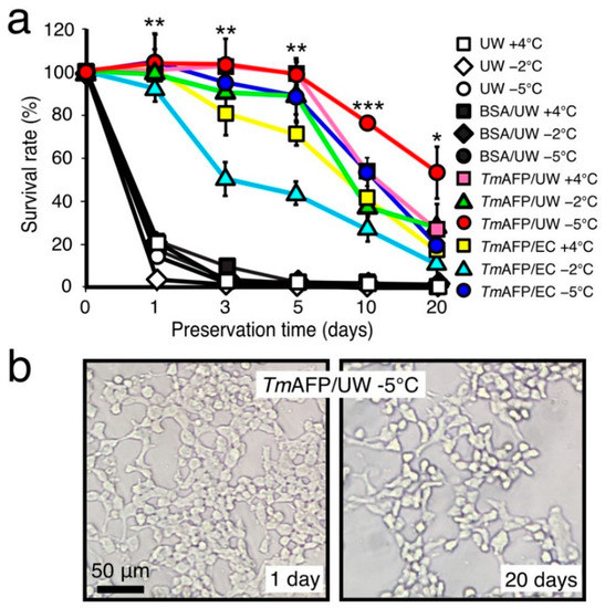 Viability improvement of RIN-5F cells by employing TmAFP-dissolved UW solution. (a) Time-dependence of the cell survival rate (%) after nonfreezing hypothermic preservation with UW solution containing 1.5 mM of BSA or TmAFP (denoted like TmAFP/UW). Preservation was performed at +4 °C, −2 °C, or −5 °C for a maximum of 20 days. The TmAFP/UW solution (red circles) achieved a 53% survival rate, even after 20 days of preservation at −5 °C. Asterisk shows that p-value vs. control (UW solution) is statistically significant (* p < 0.05, ** p < 0.01, *** p < 0.001). (b). Photomicroscope images of the RIN-5F cells after 1- and 20-day preservation periods with the UW solution containing 1.5 mM of TmAFP at −5 °C. The cells are stuck together and elongated in both images, indicating their viability.