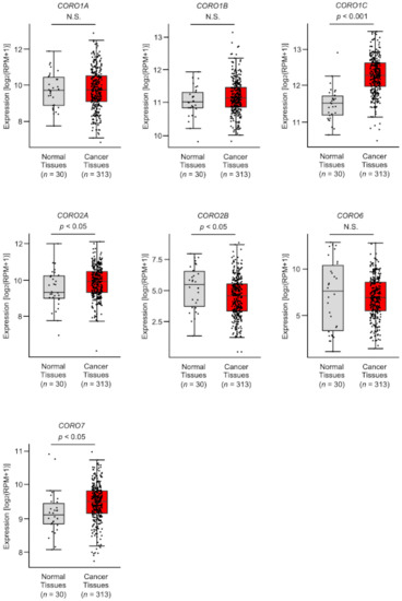 Expression levels of the coronin family members (CORO1A, CORO1B, CORO1C, CORO2A, CORO2B, CORO6, and CORO7) were evaluated using the TCGA database (TCGA-OSCC). The expression levels of three coronin genes (CORO1C, CORO2A, and CORO7) were significantly upregulated in OSCC tissues (n = 313) compared with normal tissues (n = 30) (Figure 1). On the other hand, the expression of CORO2B was significantly downregulated in OSCC tissues (Figure 1). There was no significant difference in the expression levels of the other three genes (CORO1A, CORO1B, and CORO6) between OSCC and normal tissues (Figure 1).
