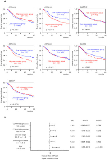 Clinical significance of all members of the coronin family by TCGA-OSCC analysis. (A) Kaplan–Meier survival curve analyses of patients with OSCC using data from The Cancer Genome Atlas (TCGA) database. Patients were divided into high and low expression groups according to miRNA expression (based upon median expression). The red line shows the high expression group, and the blue line shows the low expression group. (B) Forest plot presenting the results of a multivariate Cox regression analysis of the prognostic value of CORO1B and CORO2A identified in an OSCC dataset from TCGA (HR: hazard ratio, CI: confidence interval). The expression level of CORO2A was determined to be independent prognostic factors in terms of the 5-year overall survival rate after adjustments for tumor stage, age, and pathological grade (p < 0.05).