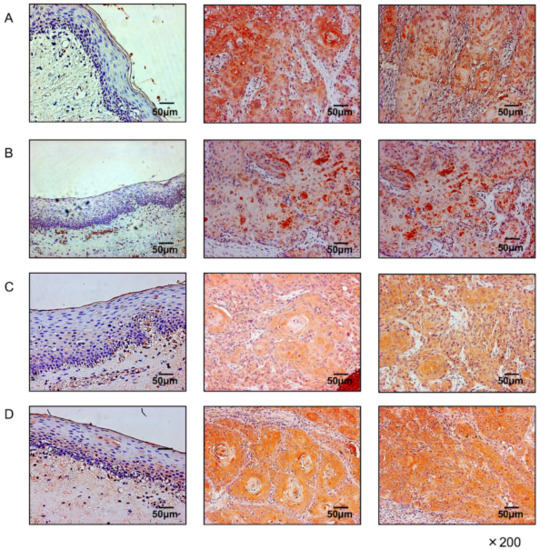 Overexpression of CORO2A in OSCC clinical specimens. Immunohistochemical staining of CORO2A in OSCC clinical specimens. High expression of CORO2A was detected in the nuclei and/or cytoplasm of cancer cells ((A–D) center and right side) and weak expression in the normal oral mucosa ((A–D) left side).