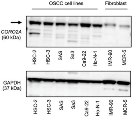 Expression levels of CORO2A in the OSCC cell lines. Expression levels of CORO2A in OSCC cell lines and normal fibroblast cell lines were evaluated with Western blotting. GAPDH was used as the internal control.