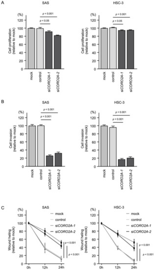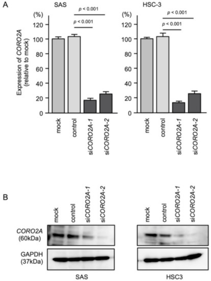 Next, the inhibitory effect of two different siRNAs targeting CORO2A (siCORO2A-1 and siCORO2A-2) on CORO2A expression was examined. The CORO2A mRNA and protein levels were effectively suppressed by transfection of both siRNAs into SAS and HSC-3 cells (Figure 5A,B).