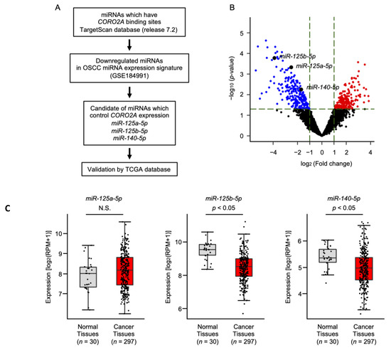 Selection of CORO2A controlled miRNAs in OSCC cells. To identify miRNAs controlling CORO2A expression in OSCC cells, we used the TargetScan database (release 7.2) and the miRNA expression signature of OSCC. (A) Flowchart of the strategy used to identify the candidate of CORO2A regulated miRNAs in OSCC cells. (B) Volcano plot of the miRNA expression signature determined through RNA sequencing. The log2 fold change (FC) is plotted on the x-axis, and the log10 (p-value) is plotted on the y-axis. The blue points represent the downregulated miRNAs with an absolute log2 FC <−1.0 and p < 0.05. (C) The expression levels of miR-125a-5p, miR-125b-5p, and miR-140-5p evaluated in an HNSCC dataset from TCGA (N.S., not significant).