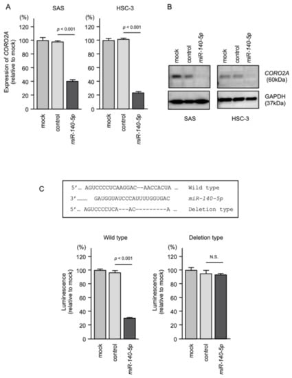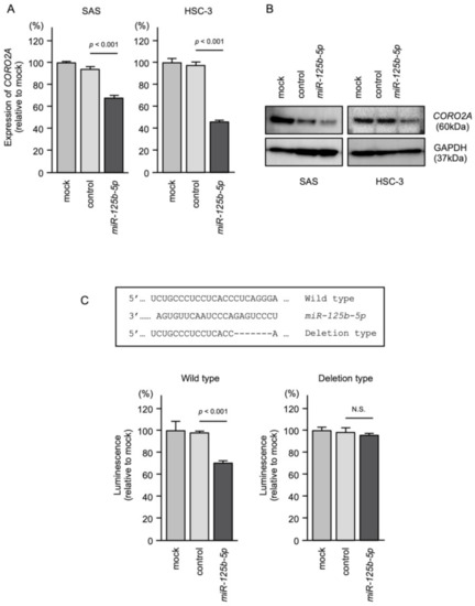 In this study, we investigated the molecular mechanisms underlying the aberrant expression of CORO2A in oral cancer, focusing on miRNAs. A vast number of studies demonstrated that miRNAs act as fine-tuners of gene expression in a sequence-dependent manner [18,19]. Tumor-suppressive miRNAs are frequently downregulated, whereas their oncogene targets are upregulated, in cancer cells. A previous analysis of our RNA-sequencing-based miRNA signature of OSCC revealed that miR-125b-5p and miR-140-5p were downregulated in cancer tissues [42]. Our present study showed that these miRNAs have tumor-suppressive roles, and miR-125b-5p and miR-140-5p directly regulate the expression of CORO2A in OSCC cells.