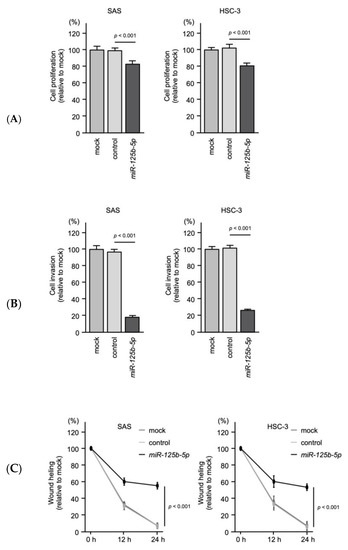 Tumor-suppressive function of miR-125b-5p in OSCC cells. (A) Cell proliferation assessed with an XTT assay at 72 h after transfection of mature miRNAs. (B) Cell invasion determined with a Matrigel invasion assay at 48 h after seeding miRNA-transfected cells into the chambers. (C) Cell migration was assessed with a wound-healing assay. Data were collected 0 h, 12 h, and 24 h after cell scratch.