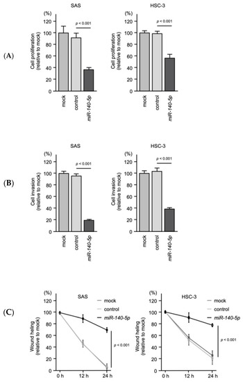 Tumor-suppressive function of miR-140-5p in OSCC cells. (A) Cell proliferation assessed with an XTT assay at 72 h after transfection of mature miRNAs. (B) Cell invasion determined with a Matrigel invasion assay at 48 h after seeding miRNA-transfected cells into the chambers. (C) Cell migration was assessed with a wound-healing assay. Data were collected 0 h, 12 h, and 24 h after cell scratch.