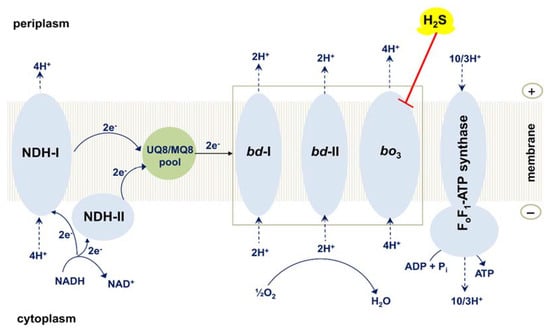 - Borisov, V.B.; Siletsky, S.A.; Paiardini, A.; Hoogewijs, D.; Forte, E.; Giuffre, A.; Poole, R.K. Bacterial oxidases of the cytochrome bd family: Redox enzymes of unique structure, function and utility as drug targets. Antioxid. Redox Signal. 2021, 34, 1280–1318. [Google Scholar] [CrossRef] [PubMed]