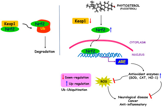 Schematic diagram representing the antioxidant mechanism of fucosterol. Up-regulation of antioxidant enzymes such as HO-1 (heme oxygenase-1), SOD, and CAT, via the Nrf2/ARE signaling pathways. The left image indicates the normal physiological conditions in which Nrf2 bound to keap1 in the cytosol undergoes degradation by the ubiquitination process.