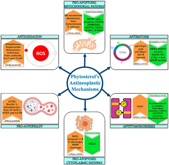 Anticancer mechanisms of phytosterols. The different modes of action giving rise to the anticancer properties of phytosterols act in different gene pathway. Controlled regulation of genes involved in antioxidation, apoptosis and antimitosis restricts the growth of the cancer cells.