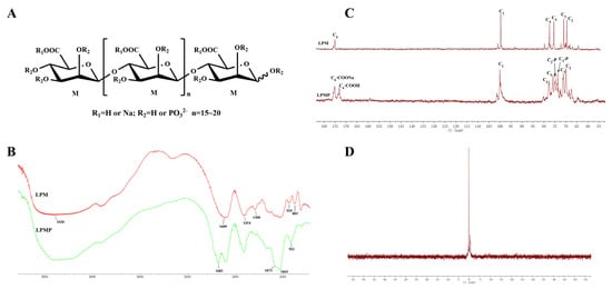 The characteristics of LPMP. (A) Chemical structure of LPMP. (B) IR spectra of LPM and LPMP. (C) The 13C-NMR spectra of LPM and LPMP. (D) The 31P-NMR spectra of LPMP.