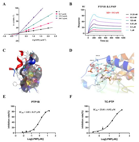 Interaction of LPMP with PTP1B. (A) Lineweaver Burk data analysis of LPMP inhibition of PTP1B. The reciprocal of the initial reaction rate (1/[V]) corresponds to the reciprocal of the pNPP concentration (1/[pNPP]) in the presence of different concentrations of LPMP. (B) Interaction of LPMP with PTP1B immobilized on the CM5 chip. (C) The binding site of PTP1B interacting with LPMP mode was shown as a molecular surface structure using MOE software. (D) A comprehensive view of the hydrogen bond and hydrophobic interactions of PTP1B-LPMP was displayed by Pymol software. (E) The IC50 value of LPMP to PTP1B. (F) The IC50 value of LPMP to TC-PTP.