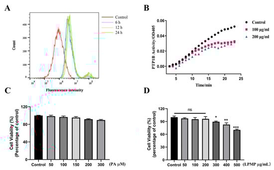 Although PTP1B inhibitors have been developed for many years, no PTP1B inhibitors have been marketed. Many compounds are promising in vitro inhibitory effects on PTP1B, but the low cellular permeability limits their future applications []. Cellular permeability is a vital prerequisite for LPMP to exert its PTP1B inhibitory effect in cells. LPMP was FITC-labeled by chemical coupling, and the measured labeling rate was 2.3‰ (see Supplementary Information). The fluorescence intensity of LPMP-FITC was measured by flow cytometry to determine the cell permeability of LPMP. The results showed that the fluorescence intensity of LPMP increased at 6 h compared with the control group, indicating that LPMP could be taken up by HepG2 cells (Figure 3A). Meanwhile, further investigation was needed to investigate whether LPMP could affect the intracellular PTP1B viability after being taken up by cells. Therefore, intracellular PTP1B protease activity was measured at different periods of LPMP treatment (100 and 200 μg·mL−1). We found that the intracellular PTP1B enzyme activity declined with the increasing duration of LPMP treatment (Figure 3B), suggesting that LPMP could affect intracellular PTP1B activity.