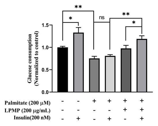 Effect of LPMP on improving insulin resistance in HepG2 cells. In the absence or presence of LPMP, HepG2 cells were treated with 200 μM PA for 24 h. Then, cells were incubated for a further 4 h with or without 200 nM insulin at 37 °C. Cellular glucose consumption was determined by detecting the reduction of glucose in the culture medium. Data are presented as means ± SEM (n = 5). * p < 0.05, ** p < 0.01.