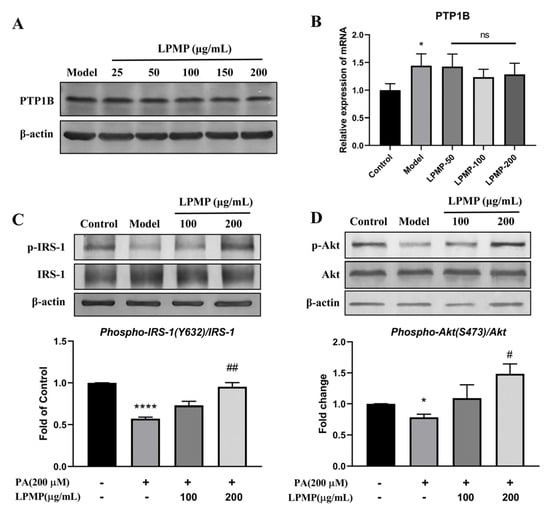 Meanwhile, insulin signaling is initiated when insulin binds to the extracellular α-subunit of the insulin receptor, and downstream phosphorylation of IRS-1 at key tyrosine residues is critical for signal transduction [,]. PTP1B plays a negative regulatory role in insulin signaling through dephosphorylation of IRS-1 tyrosine. Therefore, we explored the effect of LPMP on the insulin signaling pathway. After inducing insulin resistance in HepG2 cells by PA, cells were stimulated with 100 nM of insulin for 10 min after 24 h of LPMP treatment. The expression of phosphorylated IRS-1 (Y632) and AKT (S437) was significantly upregulated compared to the PA-treated group (Figure 5C,D). Our results confirmed that LPMP could activate insulin sensitivity by upregulating insulin signaling through activation of the IRS-1/AKT signaling pathway.