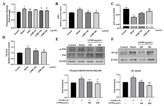 Effect of LPMP on intracellular oxidative stress in HepG2 cells. (A) Detection of ROS levels by in situ DCFH-DA probe. Model group (200 μM PA), positive drug group (100 μg·mL−1 NAC). Determination of (B) MDA and (C) SOD content. (D) Measurement of intracellular TG content. (E) Phosphorylation levels of JNK protein between the different treatment groups. (F) Variation in NF-κB protein levels between treatment groups. The band density was quantified and β-actin was used as a standard. The results shown are means ± SEM (n = 3). * p < 0.05, *** p < 0.001 versus control group; # p < 0.05, ## p < 0.01 versus model group.