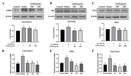 Effect of LPMP on endoplasmic reticulum stress. Treatment of HepG2 cells with different concentrations of LPMP for 24 h. (A) CHOP, (B) Bip, and (C) ATF4 protein was determined by immunoblotting. The band density was quantified and β-actin was used as a standard. The mRNA expression level of (D) CHOP, (E) ATF4, and (F) Xbp1s/Xbp1u was quantified by RT-PCR. The results shown are means ± SEM (n = 3). * p < 0.05, ** p < 0.01 versus control group; # p < 0.05, ## p < 0.01 versus model group.