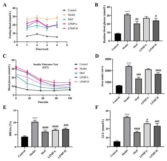 Effects of LPMP treatments on (A) fasting blood glucose levels, (B) random blood glucose levels, (C) insulin tolerance test, and (D) areas under the curve of insulin tolerance test of each group in diabetic mice. (E) HbA1c and (F) glucose concentrations. These results shown are means ± SEM (n = 8). **** p < 0.0001 versus control group; # p < 0.05, ## p < 0.01, ### p < 0.001, #### p < 0.0001 versus model group.